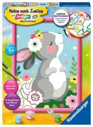 Malen nach Zahlen“ liegt im Trend! Und was macht zu Ostern mehr Spaß, als selbst ein wunderschönes, verträumtes Häschen zu malen und dabei rundum zu entspannen? Bei „Malen nach Zahlen“ von Ravensburger können jungen Hobbykünstler das Motiv dank farbiger Motivlinien dabei von Anfang an gut erkennen – und mit den Komplettsets sofort loslegen. Die Sets umfassen die Maltafel und Farbnäpfchen mit fertig gemischten, kindgerechten Acrylfarben. Diese können auf der mitgelieferten Farbpalette rofessionell sortiert werden. Also einfach auspacken, Pinsel zur Hand nehmen und Farbe für Farbe, Feld für Feld mit der kreativen Beschäftigung beginnen. Bis das süße Häschen als kleines Kunstwerk entsteht – und ein einem weißen Rahmen österliche Akzente im Kinderzimmer setzt.