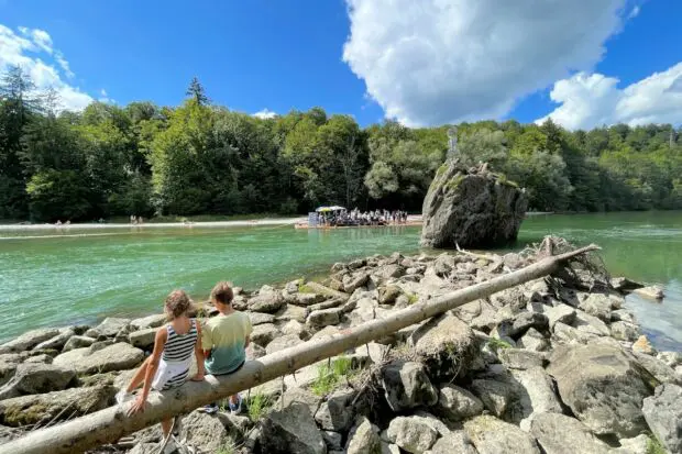 Dann sahen wir schon den Stein aus der Isar ragen. Dort machten wir Pause, hingen die Füße ins Wasser und schauten den Flößen zu. Weiter ging es durch die herrlichen Isarauen; durch den bayerischen Urwald :-) Nach ca. 15 Minuten gelangten wir zur außergewöhnlichen Fischtreppe am Wasserkraftwerk. Eine perfekte Stelle für ein Picknick.