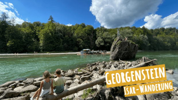 Nachdem wir ca. 50 Minuten unterwegs waren kamen wir am Georgenstein an. Der große Felsblock ragt ca. fünf Meter hoch aus der Isar. Er war damals der Schrecken der Flößerei. Hier genossen wir die Stille (November, 15 Uhr nachmittags) und die Kids ließen es sich nicht nehmen den Felsen zu erklimmen. Hinauf ging es leichter als runter. Aber alle sind heil wieder unten angekommen :-).