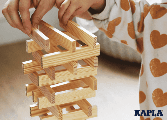 Ein einziger Baustein ist es, das berühmte magische KAPLA Plättchen und eine einzige Regel, die Schwerkraft und schon geht es los, und zwar schon ab 2 Jahren!