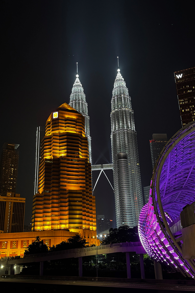 Die Petronas Twin Towers sind das Wahrzeichen der Stadt – und sie beeindrucken tatsächlich rund um die Uhr. Tagsüber glitzern die Glasfassaden in der Sonne, nachts erstrahlt das Paar im Lichtermeer und spiegelt sich im künstlichen Teich am Fuße der Türme. Wir haben auf die teuren Plattform-Tickets verzichtet, denn unser Appartement besaß eine traumhafte Dachterrasse mit freiem Blick auf die Türme. So konnten wir das Spektakel ganz entspannt vom eigenen „Balkon“ aus genießen.