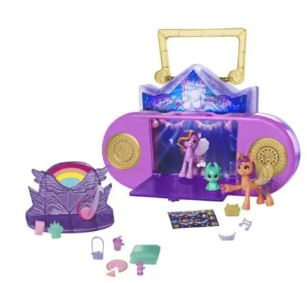 Mit dem Zaubermelodie Radio können kleine Fans das Ponyfunkeln entdecken, denn dies ist sowohl ein Salon als auch eine Karaokebühne, inspiriert von der Serie My little Pony – Entdecke dein Ponyfunkeln. Das Zaubermelodie Radio ist ein 2-in-1 Spielset mit Lichtern und Geräuschen, die von den Ponys aktiviert werden. Auf der einen Seite befindet sich ein Salon mit einem Mähnenföhn, einer Garderobe für Accessoires und einem Regenbogenspielgel zum fantasievollen Spielen. Wird die andere Seite des Spielsets geöffnet, kommt eine Karaokebühne mit Lichtern und Sounds zum Vorschein. Um die Musik zu aktivieren, muss nur der „Play“-Knopf gedrückt, oder ein Pony auf die Bühne gestellt werden. Jedes Pony aktiviert eigene Lichter und Musik! Enthält die 7,5 cm großen Sunny Starscout und Prinzessin Petals Ponyfiguren und den Babydrachen Sparky Sparkeroni. Es gibt noch weitere Cutie Mark Magic Ponys, die andere Lichter und Musik aktivieren! (Zusätzliche Figuren sind separat erhältlich. Je nach Verfügbarkeit.) Enthält 16 Accessoires, Stickerbogen und 2 Schönheitsflecken Charms.