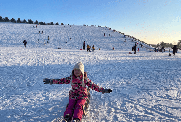 Gegenüber des steilen Hügels befindet sich ein sanfterer Hügel, ideal für alle, die es ruhiger angehen lassen möchten. Hier können die Kleinen ihre ersten Rodelversuche wagen, ohne dass es zu aufregend wird. Auch Familien, die einfach entspannt zusammen Spaß haben wollen, finden hier ausreichend Platz.