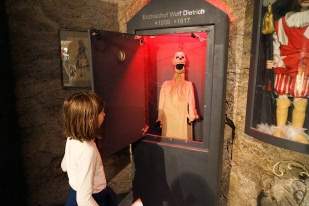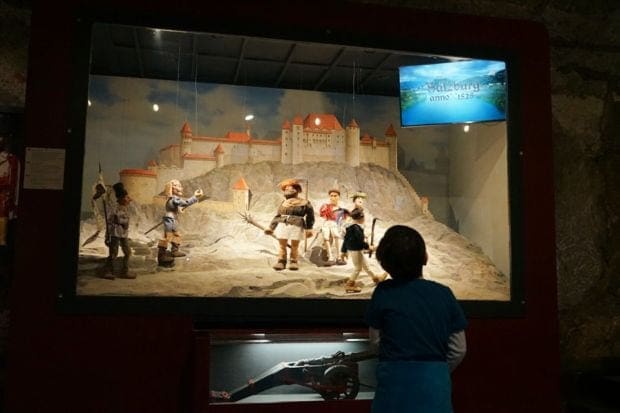 Bestückt mit dem Audioguide starteten wir unsere Tour durch die Festung. Das Schöne am Rundgang auf der Festung war, dass wir immer wieder nach draußen gelangten. Die Kids konnten sich auf dem Burghof frei bewegen und eine Burgschänke bietet eine nette Einkehrmöglichkeit. Wir haben viel über die Entstehungsgeschichte der Burg, den Kerker und den berühmtesten Gefangenen der Burg „Erzbischof Wolf Dietrich von Raitenau“ erfahren. Den Erzbischof trafen wir auch im Marionettenmuseum wieder. Besonders toll war der Ausblick vom Turm auf die Stadt und die Berglandschaft des Salzburger Landes.