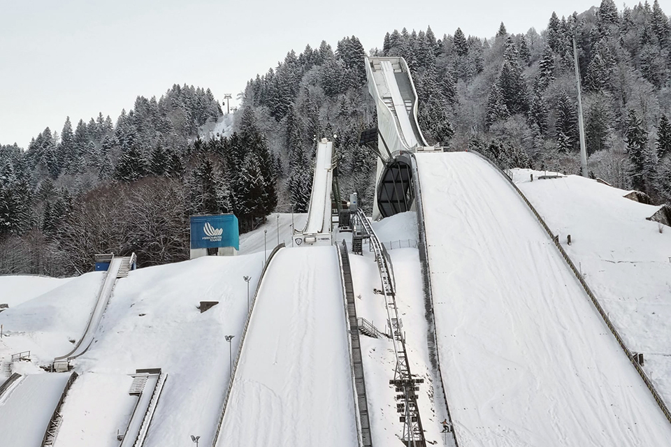 Der Startpunkt der Wanderung ist auch etwas besonderes: vom Parkplatz an der Skischanze führt der Weg direkt an der Schanze vorbei. Gerade im Winter hat das einen ganz eigenen Reiz. Alles war tief verschneit, die riesige Anlage wirkte still und fast ehrfürchtig. Die leeren Zuschauertribünen der Große Olympiaschanze versprühen eine ganz besondere Atmosphäre.
